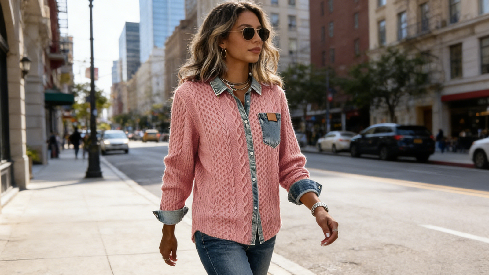 • No need to painstakingly pair a denim shirt with a knit sweater, one piece does it all. The contrasting colors of the soft pink knit sweater and distressed denim create a gentle yet American retro look, flattering even for those with yellow or dark skin tones.