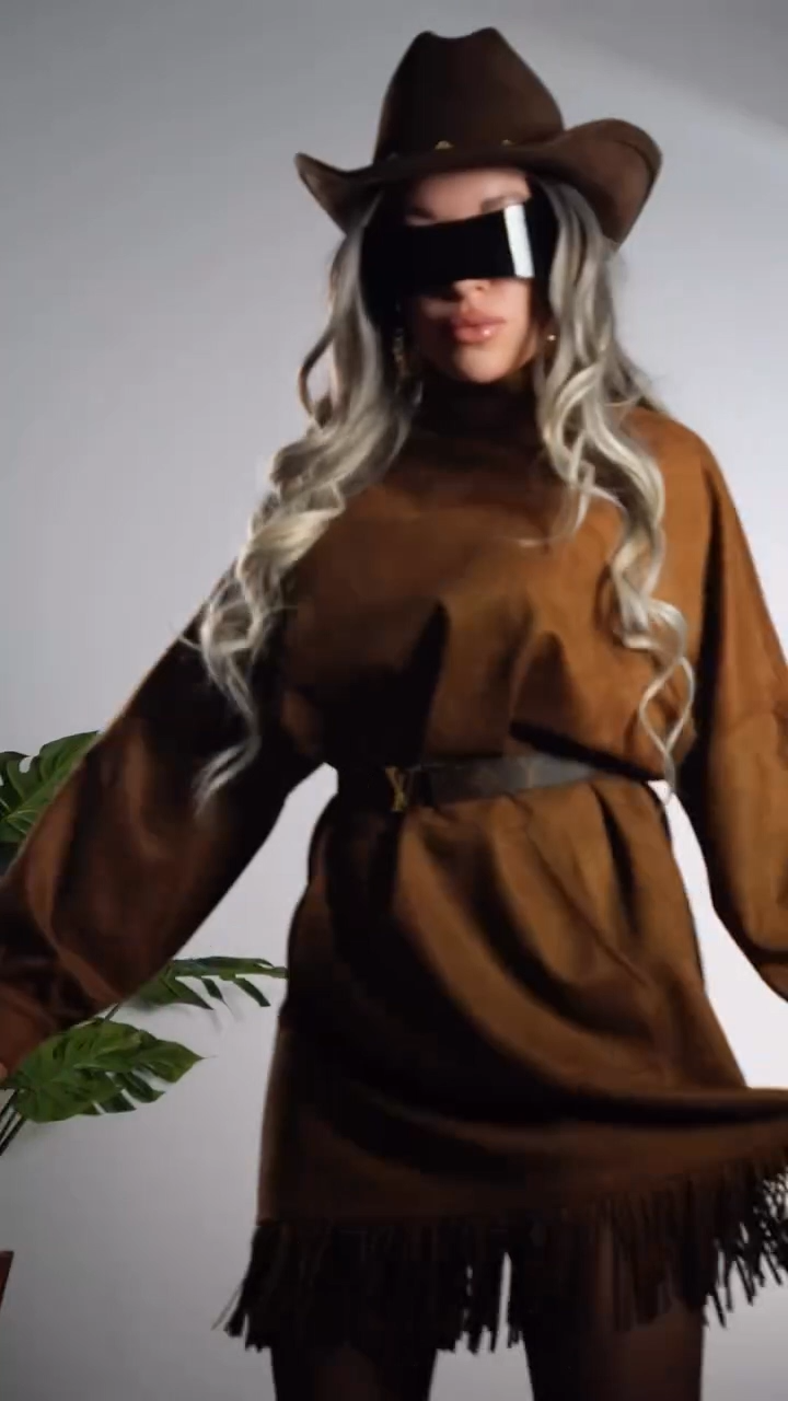 Soft suede mini dress with a refined stand collar, playful tassel hem, and voluminous balloon sleeves. Effortlessly blends casual charm with chic boho flair for versatile day-to-night styling.