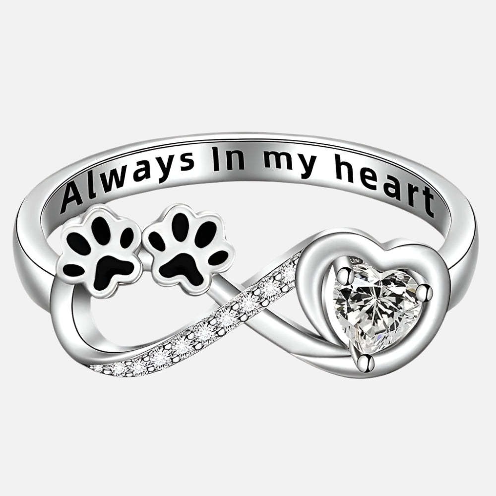 This touching paw print ring captures the unconditional love of your furry companion in an elegant infinity design. Tenderly inscribed inside with 'Always in my heart' – a promise that your beloved pet's memory will stay with you forever. Two delicate paw prints, a sparkling CZ heart, and an infinity symbol come together in this meaningful tribute piece.