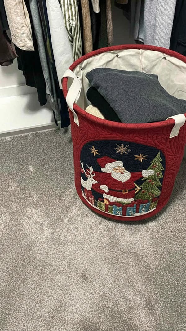 My kids love the Santa basket during the holidays! We use it to collect pajamas and blankets by the tree. It’s sturdy but soft, and folds flat when we put it away.